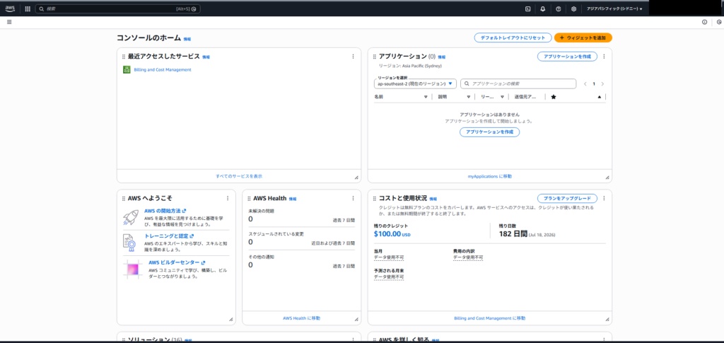 待機が完了すると AWSマネジメントコンソール(コンソールのホーム) が表示されます。