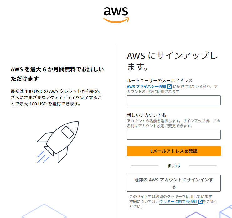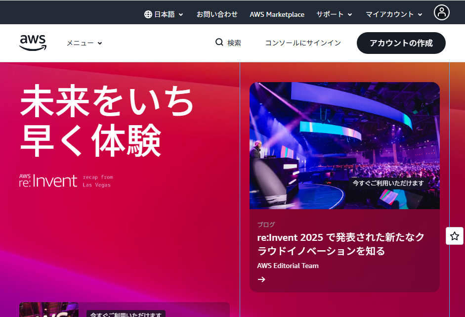 ブラウザで AWS の公式サイトを開き、「AWSアカウントを作成」(Create an AWS Account)を選びます。