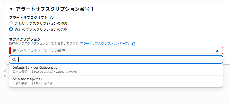 アラートサブスクリプション番号で「既存のサブスクリプションの選択」を選び、先ほど作成した cost-anomaly-mail を指定します。