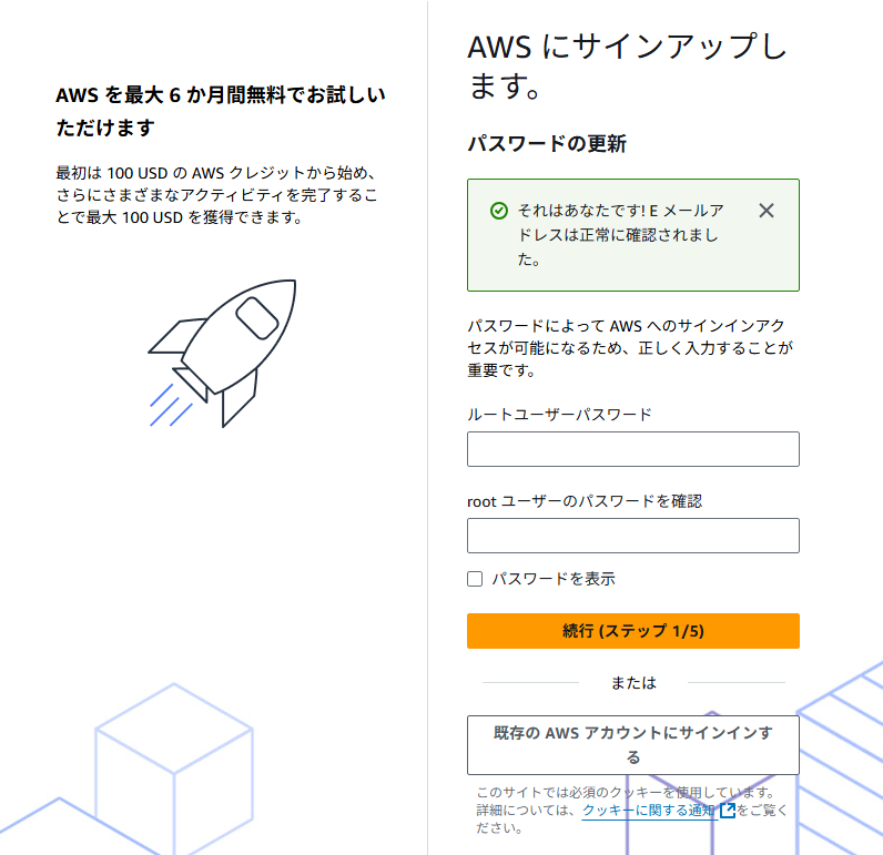 メール認証が完了したら、「ルートユーザーパスワード」と「rootユーザーのパスワードを確認」を入力し、「続行(ステップ1/5)」を押して次へ進みます。