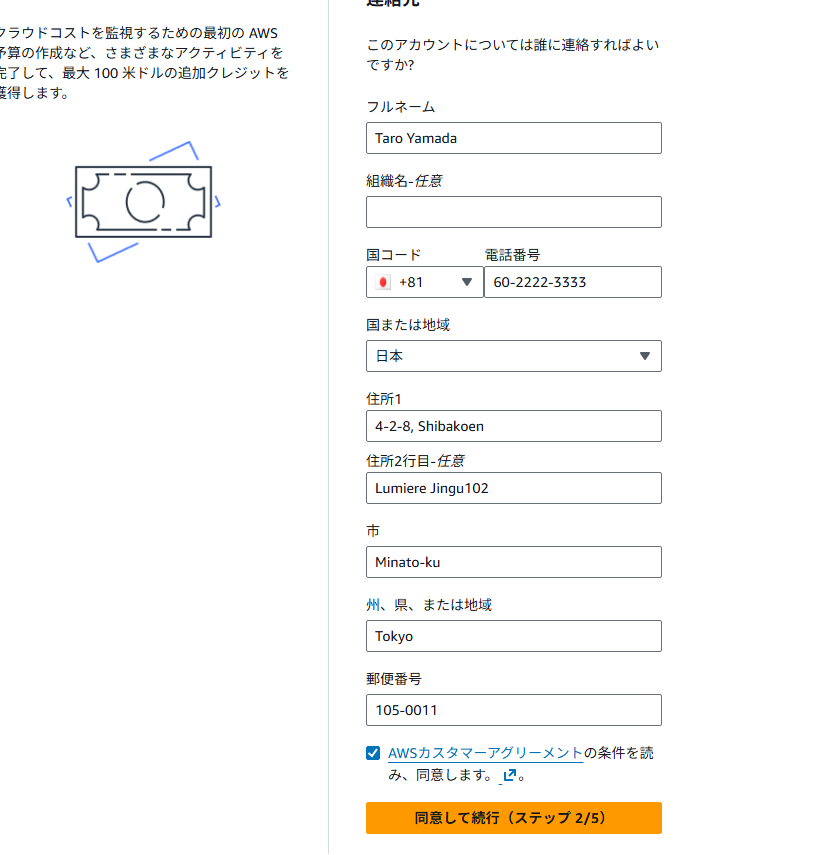 「Personal(個人)」または「Business(会社)」を選び、氏名や住所、電話番号を入力します。