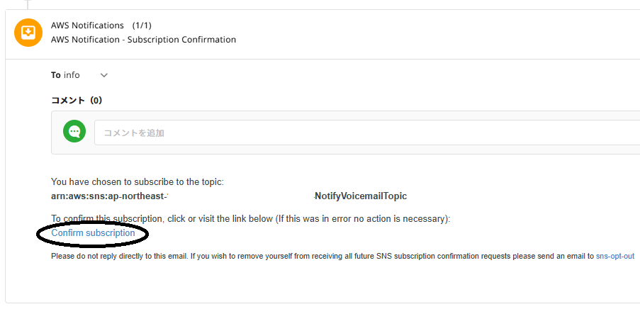 SNSから購読確認メールが届くので、メール内のリンクを開いて Confirm subscription を完了させます。