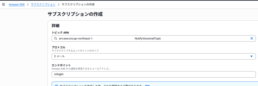 (例:arn:aws:sns:ap-northeast-1:xxxx:connect-voicemail-notify)