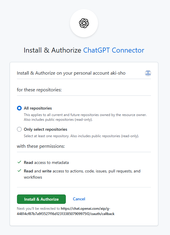 ▶ Install & Authorize をクリック - 認可が完了すると、ChatGPT Codex と GitHub の接続が完了します。