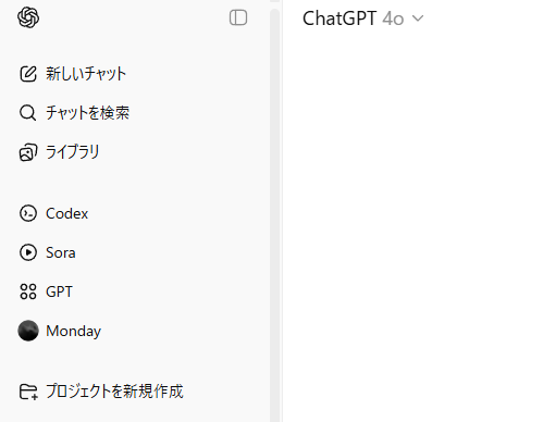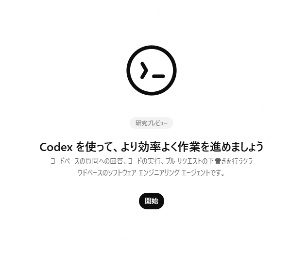 ChatGPTの通常画面の左側にあるメニューに「Codex」という項目が追加されています。この「Codex」をクリックします。 - 「開始」ボタンを押す