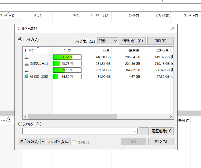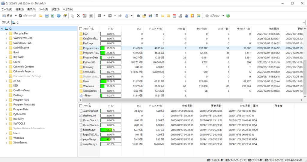 • 解析が完了すると、各フォルダやファイルのサイズが一覧表示され、棒グラフで視覚的に確認できます。
