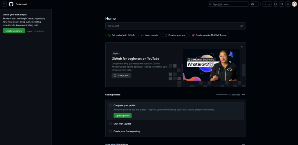 ここからリポジトリの作成やプロフィール設定など、各種操作が可能です。