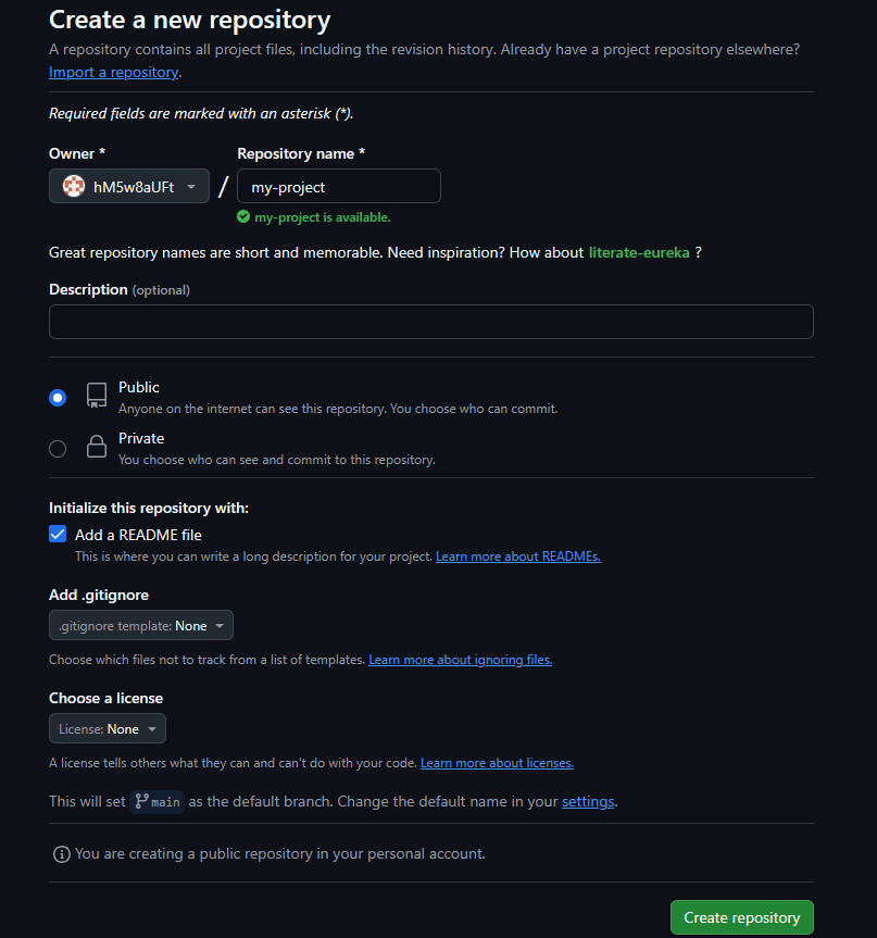 | Repository name* | リポジトリ名を入力(例:my-project) ※GitHub全体で重複していてもOK(ただし同じユーザー内では重複不可) |