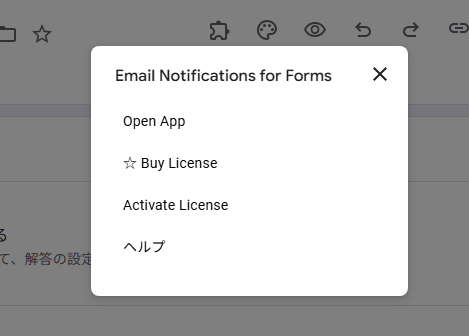 右上にある パズルアイコン(アドオン) をクリックし、一覧から「Email Notifications for Google Forms」を選択。