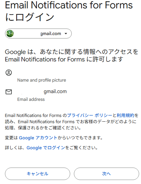 [インストール] → [続行] → Googleアカウント選択 → [次へ] → [許可] → [完了]