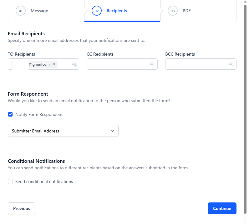 • Form Respondent:回答者に送信する場合は「Notify Form Respondent」にチェック → プルダウンから「Submitter Email Address」を選ぶ