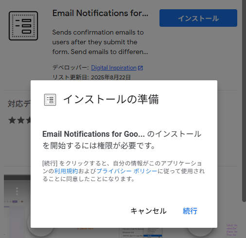 検索バーに「Email Notifications for Google Forms」と入力し、インストールを進めます。