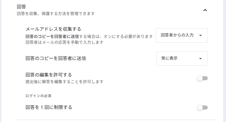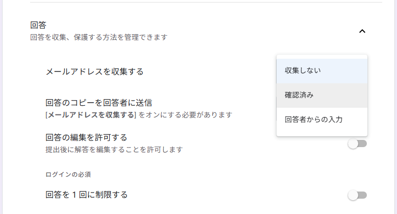 これにより、回答者は Google アカウントでログインしてから回答する必要があり、そのメールアドレスが自動的に収集される仕組みになります。