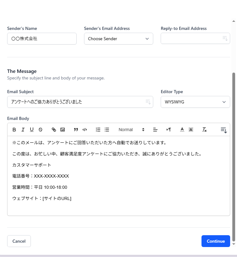 • Email Body:本文。{{All Answers}} を挿入すると回答内容が差し込まれます