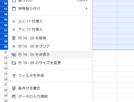 選択した行のいずれかで右クリックし、「行を非表示」を選択します。これで1~10行目が非表示になります。