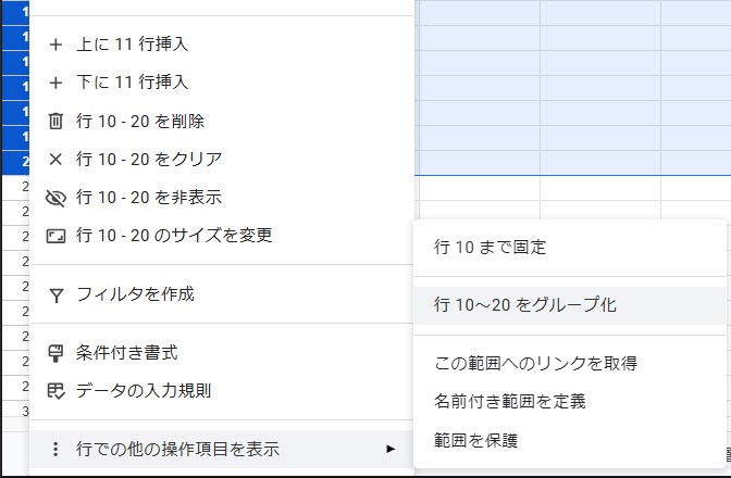- 選択した行または列の上で右クリックし、行での他の操作項目を表示↠「行〇〇~〇〇をグループ化」または「列をグループ化」を選択します。