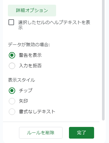 警告を表示:決められた値以外も入力出来ますが、セルにカーソルを合わせると、無効というメッセージがセル横に表示されます。値を入力した時、一部だけ修正する時に便利です。