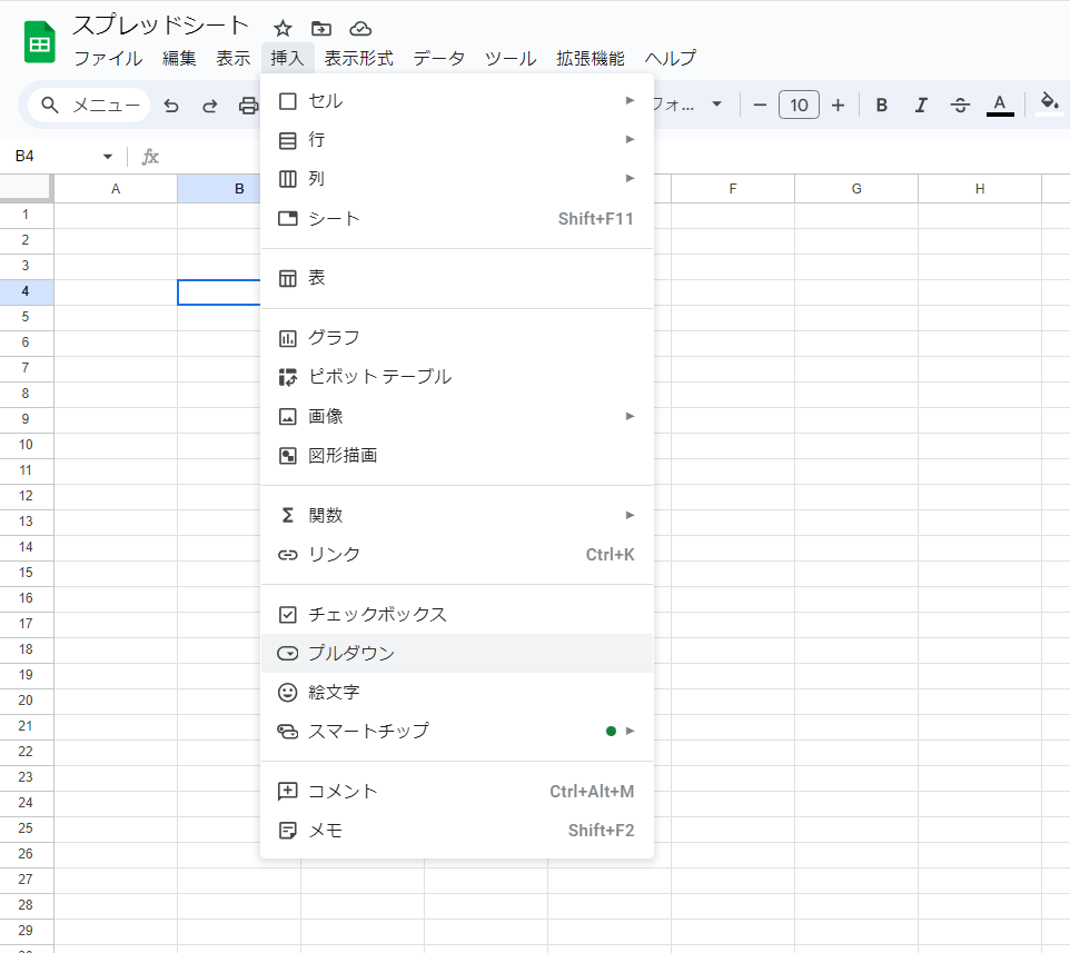- メニューから「挿入」を選択し、「プルダウン」をクリックします。