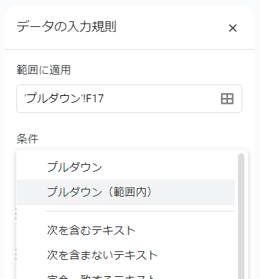 範囲指定は、シートに値を指定して、プルダウンでセルの範囲指定をします。