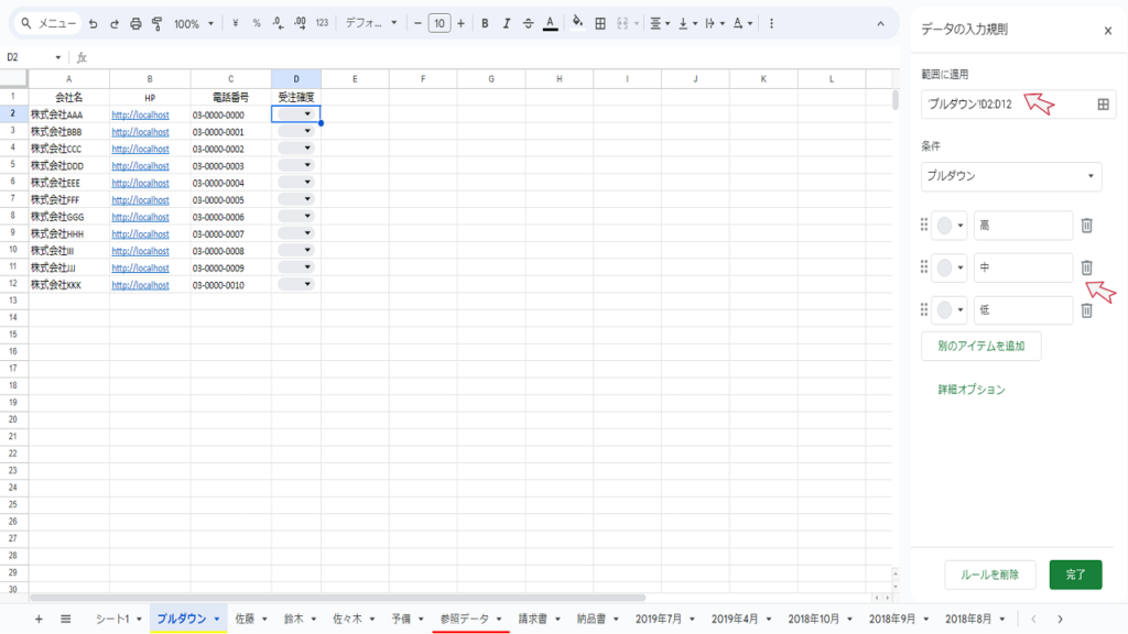 直接指定は、シートに値を指定せずに、プルダウンのアイテム欄に直接指定します。
