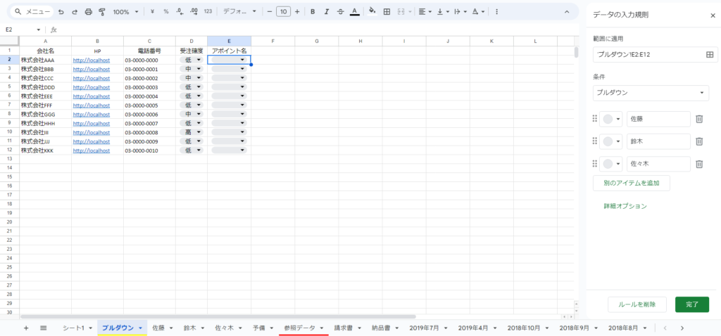 下記の例では、同じプルダウンシートを参照する形で、範囲指定を【=’プルダウン’!B17:B20】と設定しています。ただし、この範囲が「購入確度」のデータに対応しておらず、内容と合っていないことに途中で気づきました。申し訳ございませんが、このまま手順を説明させていただきます。