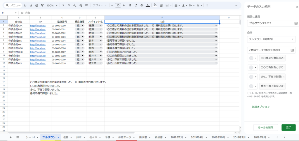 たとえば、顧客管理表で「確度」や「ステータス」をプルダウン化すれば、異なる担当者がデータを編集する場合でも、一定の規則に基づいて入力できるため、情報のばらつきを防げます。日々の運用に合わせてプルダウンのルールを見直し、必要に応じてアイテムを追加・修正していくと、より使いやすいデータ入力環境が整うでしょう。