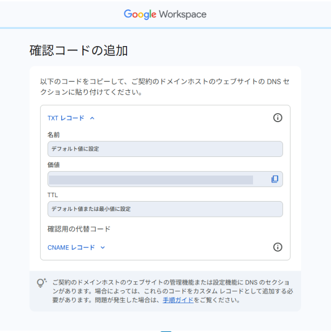 次の画面では、Google が発行した確認コードをドメインのDNSに追加するよう案内されます。