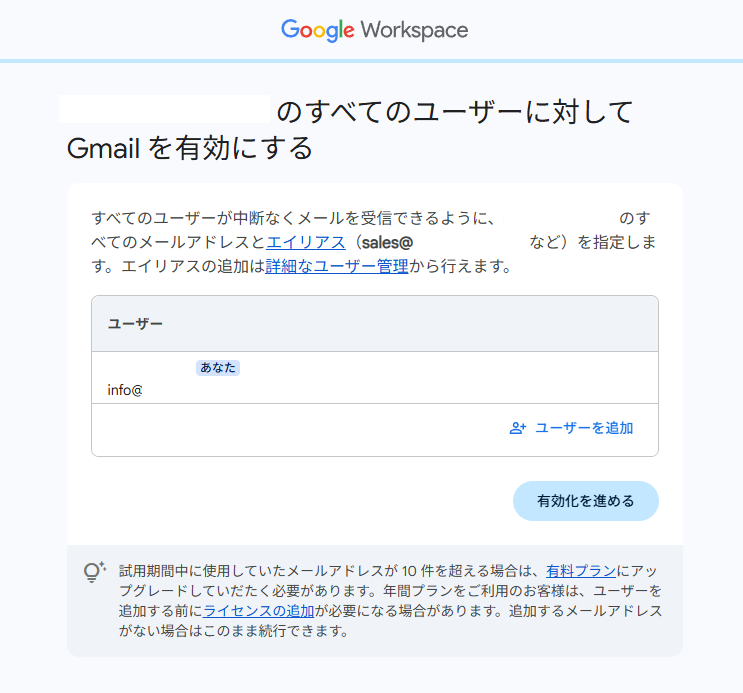 必要に応じて ユーザーを追加 し、「有効化を進める」をクリックします。