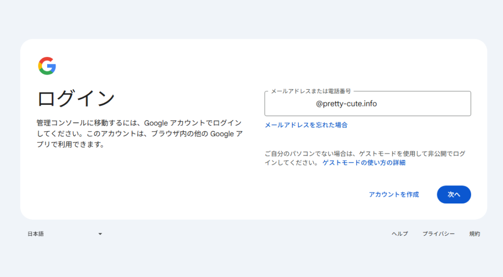 作成したメールアドレス(例:admin@pretty-cute.info)でGoogleにログインします。