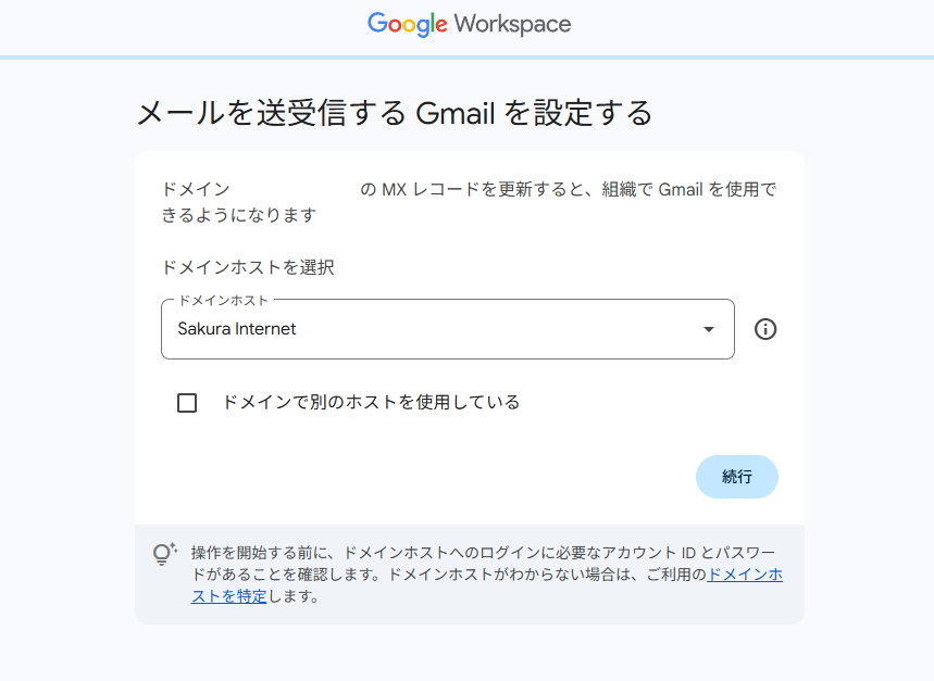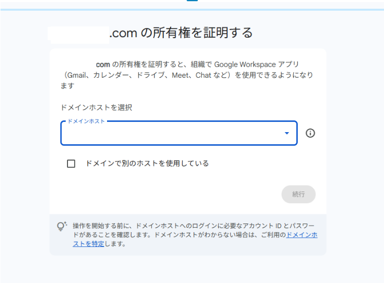 次に、所有しているドメインをどのホスト(お名前.com、さくらインターネット、Xserverなど)で管理しているかを選びます。ホストを選択すると、Google Workspaceがそのサービスに合わせた設定方法を案内してくれるので安心です。
