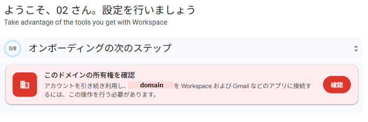 DNSに必要なレコードを追加したら、次にドメインの所有権を証明する作業を行います。これにより、Google Workspaceの各種アプリ(Gmail、カレンダー、ドライブ、Meet、Chatなど)が利用可能になります。管理画面にログインすると、オンボーディング画面に「このドメインの所有権を確認」という案内が表示されます。