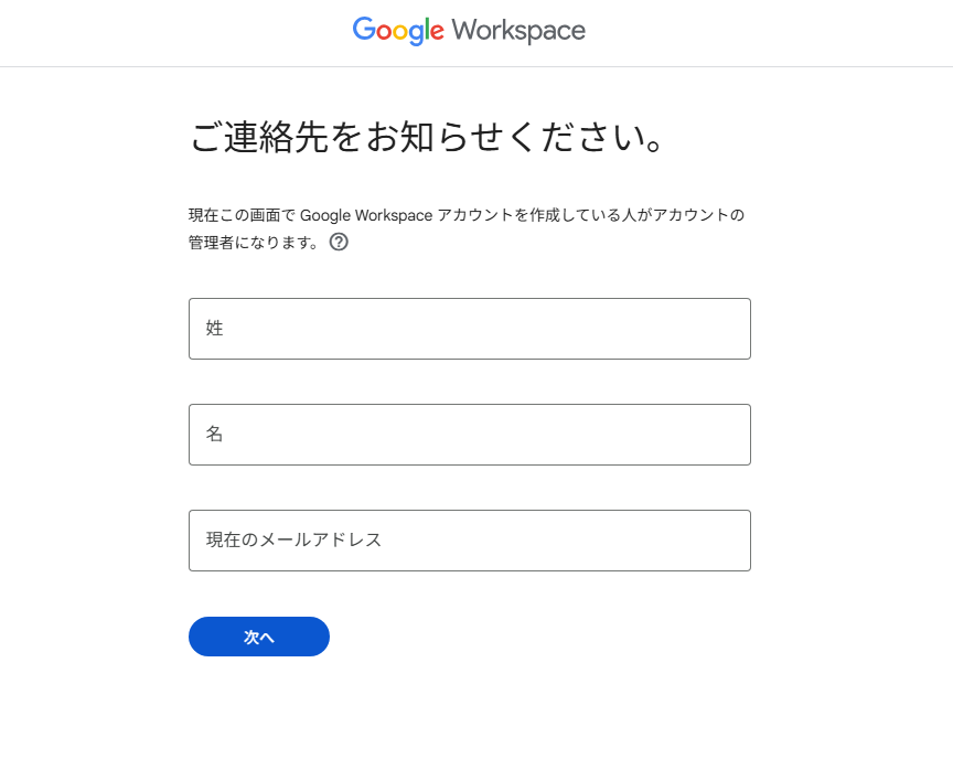 次に、Google Workspaceアカウントの管理者情報を入力します。