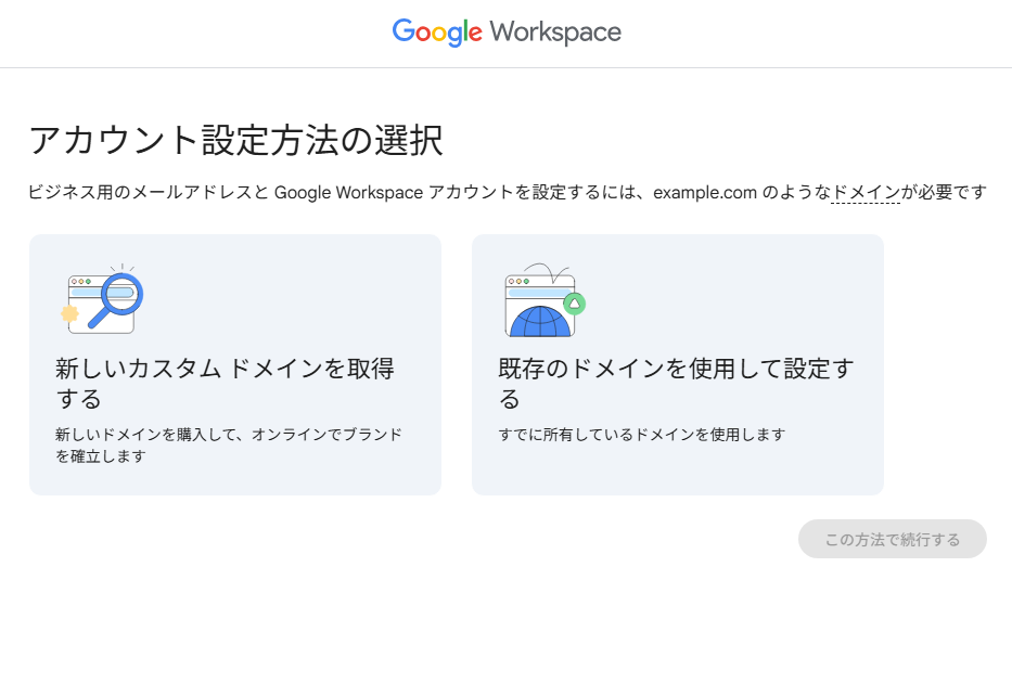 Google Workspaceでは、独自のメールアドレス(例:info@example.com)を使用するためにドメインが必要です。