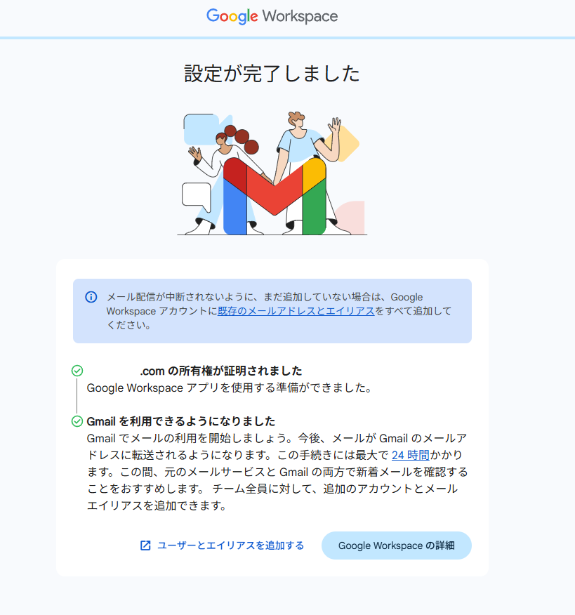 これでGoogle Workspaceの利用準備が整い、次のステップに進むことができます。