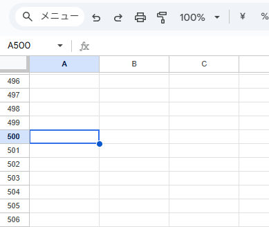 画面右側のスクロールバーは、最も手早く大まかな位置へ移動できます。スクロールバーのつまみを掴んで下へ動かすと、行数が多いシートでも一気に下方向へジャンプできます。目的の行が「だいたい下のほう」と分かっているときに便利です。