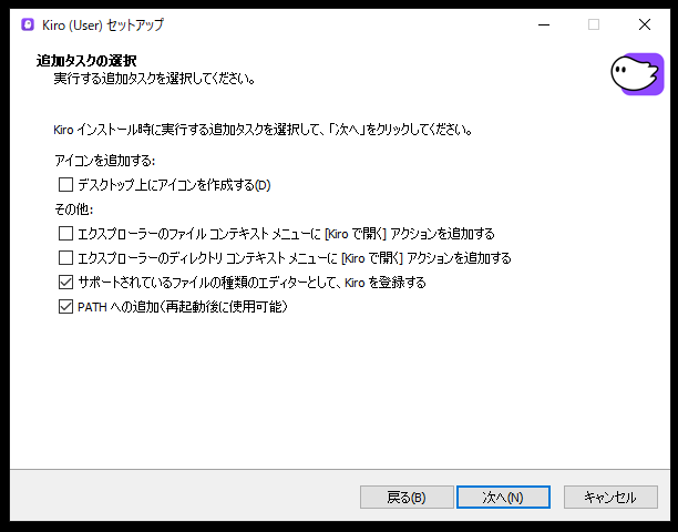 Kiro のインストールは、基本的に「次へ」を押していくだけで完了します。