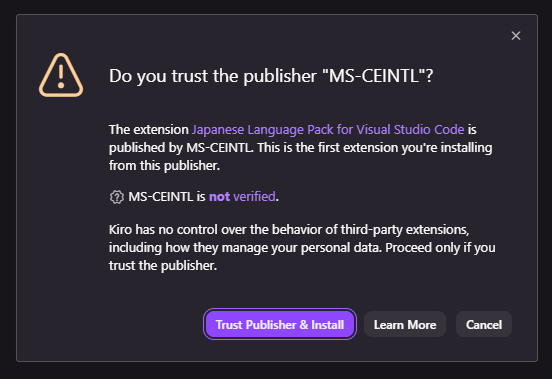 → Kiro側の仕組みでは「発行元が検証済み表示になっていない」という意味です(=危険確定ではなく、Kiro側で“公式マーク”が付いてない状態)。