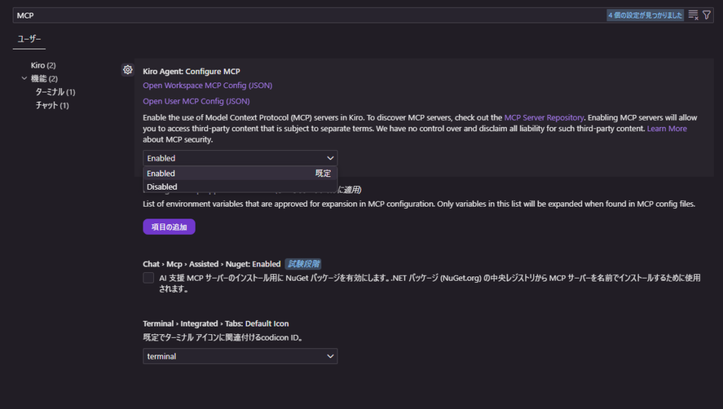 Kiro IDE では、設定(Settings)で “MCP” を検索して MCP support を有効化する導線があります。