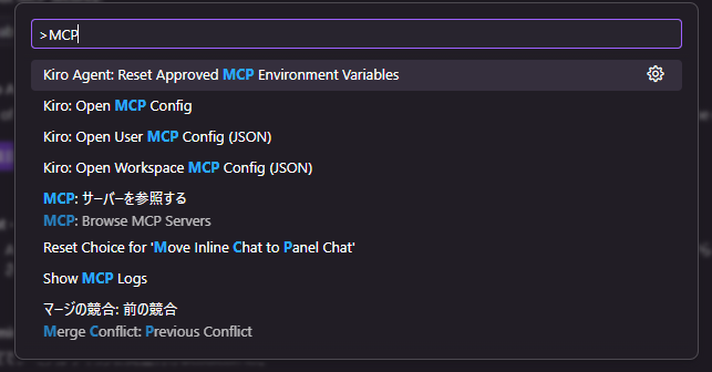 - Kiro: Open user MCP config (JSON)(ユーザー全体で使う設定)を選ぶ