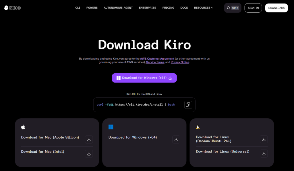 まずは公式サイトからまずは公式サイトの Download Kiro から Windows 版を入手します。