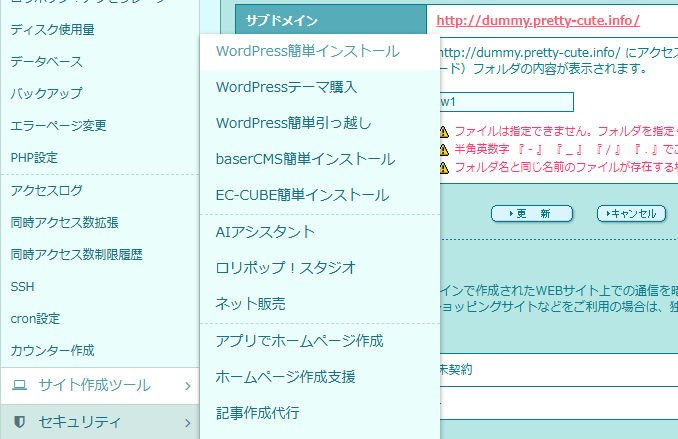 1. 「ユーザー専用ページ」→「サイト作成ツール」→「WordPress簡単インストール」を開く