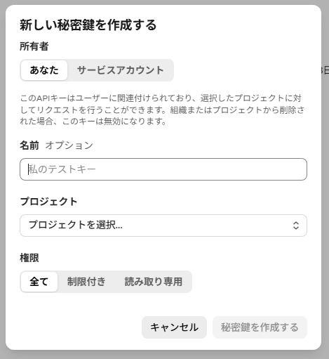 OpenAIプラットフォームの管理画面にあるボタンを押すと、秘密鍵作成用のウィンドウが表示されます。 - 名前を入力する