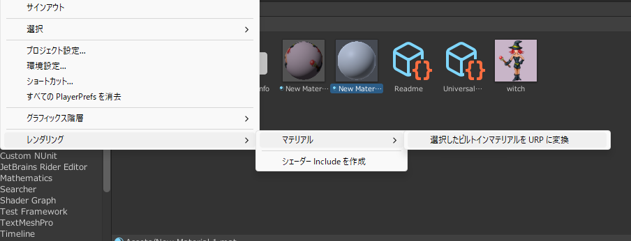 「編集 (Edit)」→「レンダリング (Rendering)」→「マテリアル (Materials)」→「選択したBuilt-inマテリアルをURPに変換 (Convert Selected Built-in Materials to URP)」 を選択。これにより、既存のBuilt-inマテリアルをURPに対応させ、ピンク色の表示などの問題を解消できます。