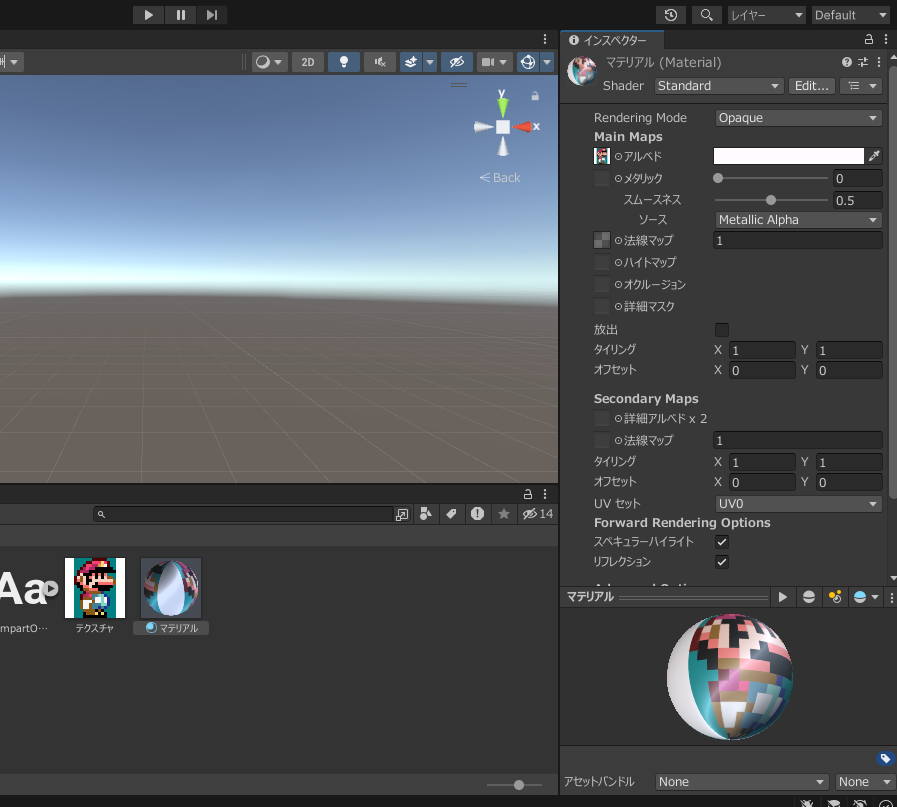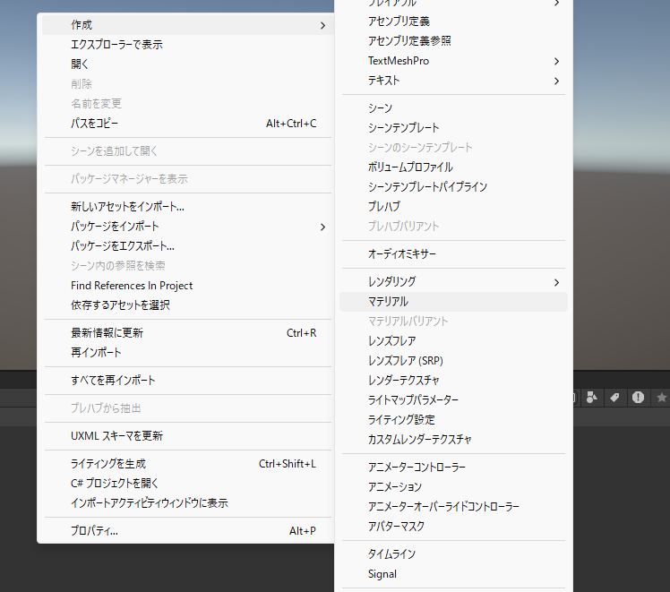 - Projectウィンドウで右クリックし、作成(Create) > マテリアル(Material)を選択します。