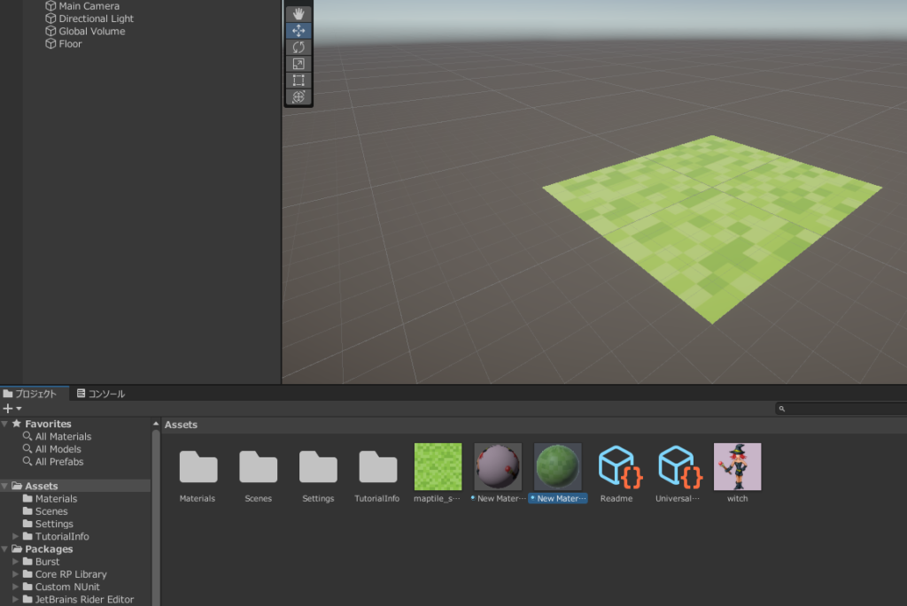 - Projectウィンドウからマテリアルを作成し、Planeにドラッグ&ドロップで適用。