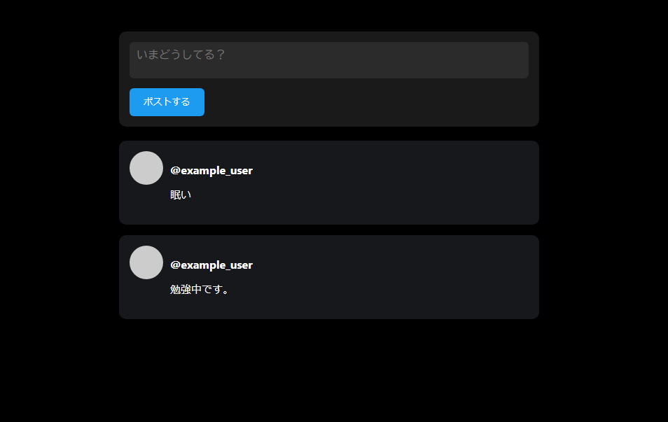 HTMLだけでは見た目がとても素っ気ないので、ここでCSSを使ってTwitter風に整えていきます。ダークモード風の配色、カード型の投稿、角丸のアバターなど、SNSらしい雰囲気を再現します。