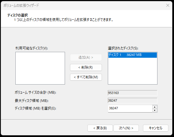 - 「ボリュームの拡張ウィザード」が表示されるので、案内に従い、Eドライブの削除によって作成された「未割り当て領域」をDドライブに追加します。