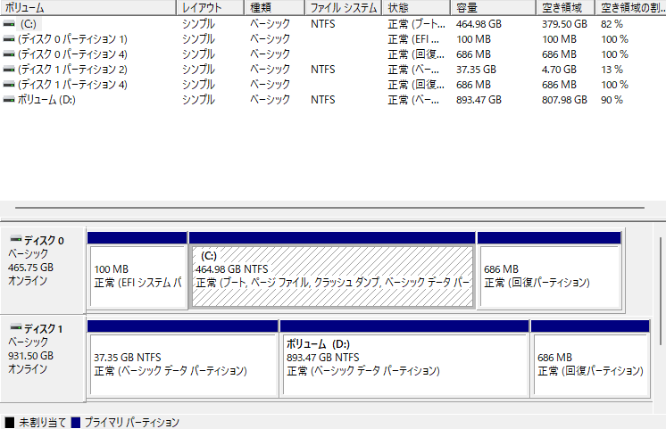 - 回復パーティションや予約済みパーティションの有無も確認。