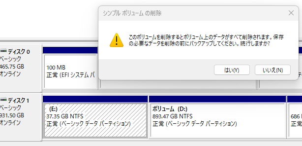 - Eドライブを右クリックして、「ボリュームの削除」を選択。
