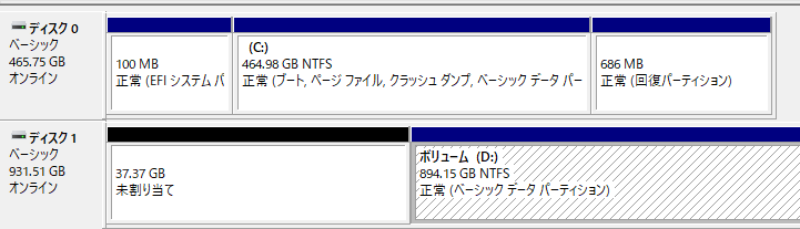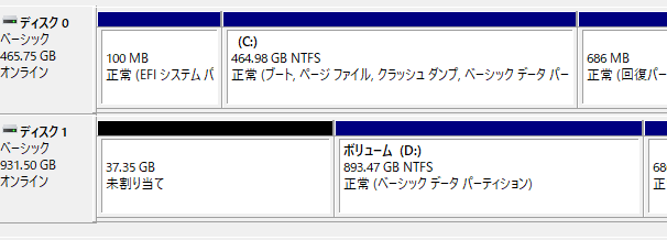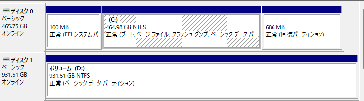 ディスク 1 オンライン 931 GB 2048 KB *Bash例:ディスク 0(メインディスク)、ディスク 1(追加ディスク)が表示される。
